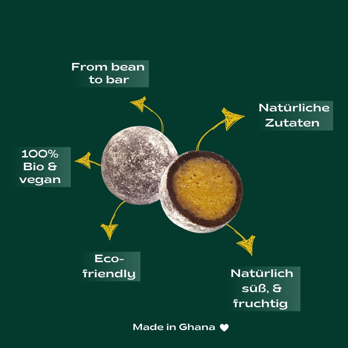 Unsere Ananas Fruit Balls vereinen intensive Fruchtigkeit und sanfte Bitternoten zu einem außergewöhnlichen Geschmackserlebnis – handgemacht in unserer Schokoladenmanufaktur in Ghana.