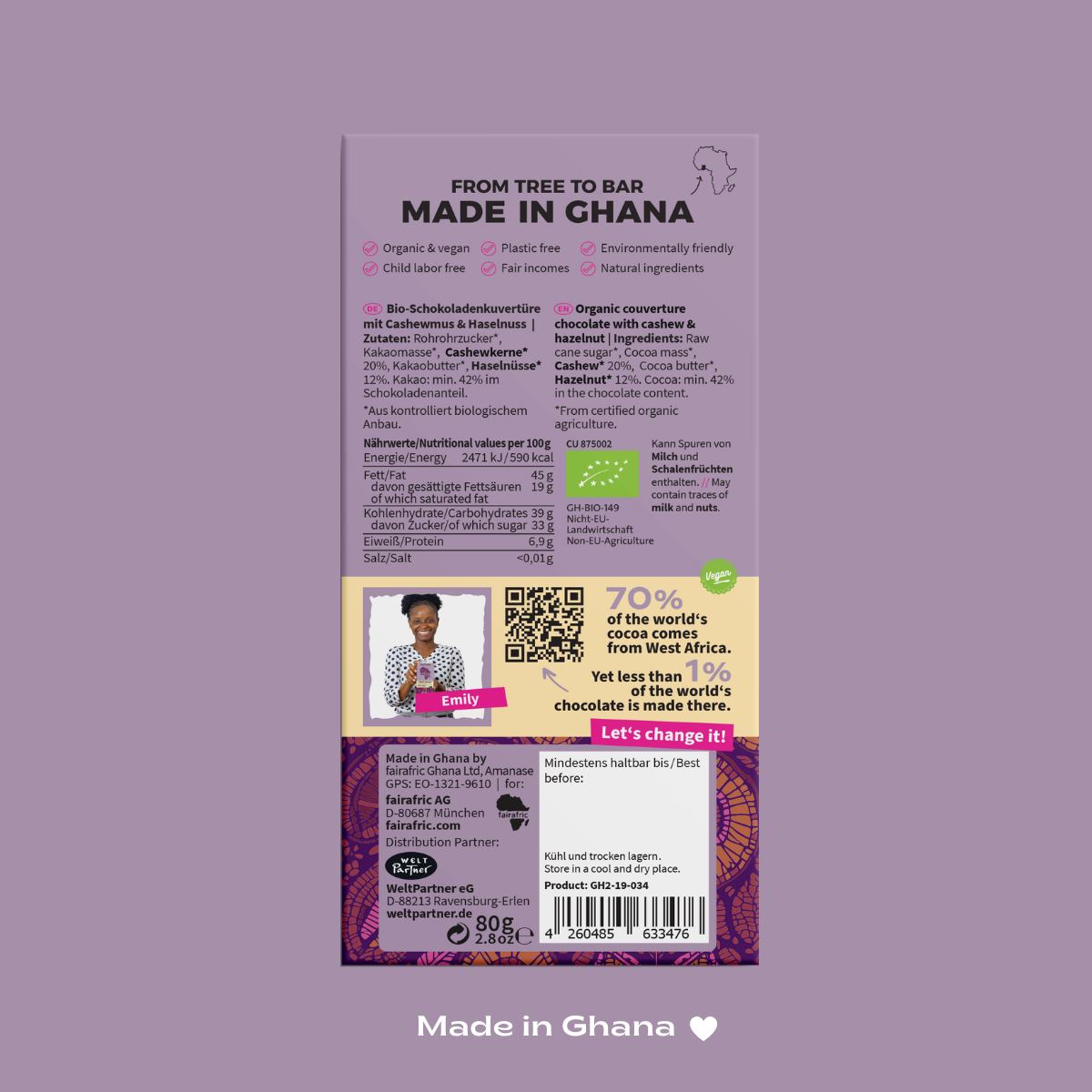 Kakaomasse*, Cashewkerne* (20%), Kakaobutter*, Haselnüsse*, Rohrohrzucker* (12%). Schokoladenanteil enthält mindestens 42% Kakaotrockenmasse.