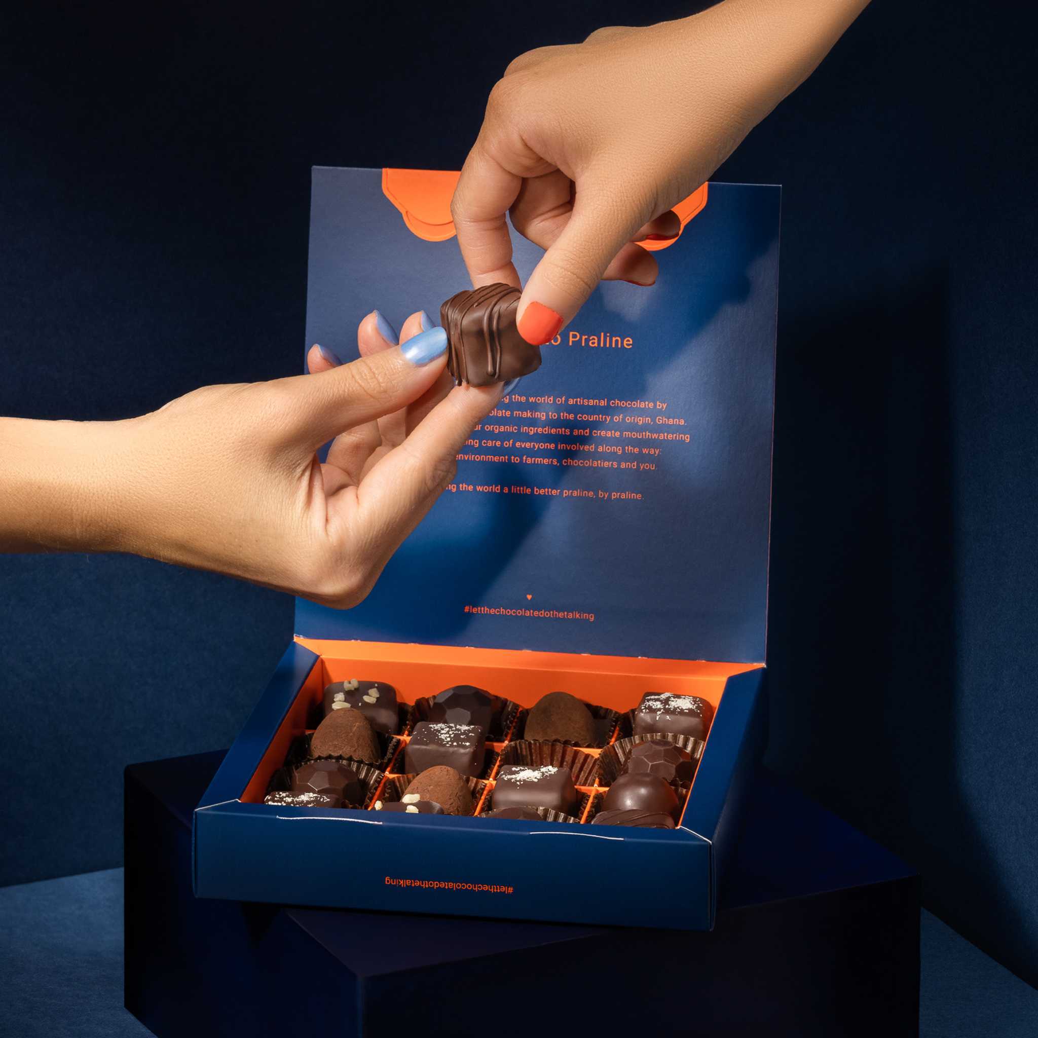 Every praline promotes organic cocoa farming and ensures fair pay for cocoa farmers - all products come plastic-free and are produced CO2-neutrally in Ghana's first solar-powered chocolate factory!